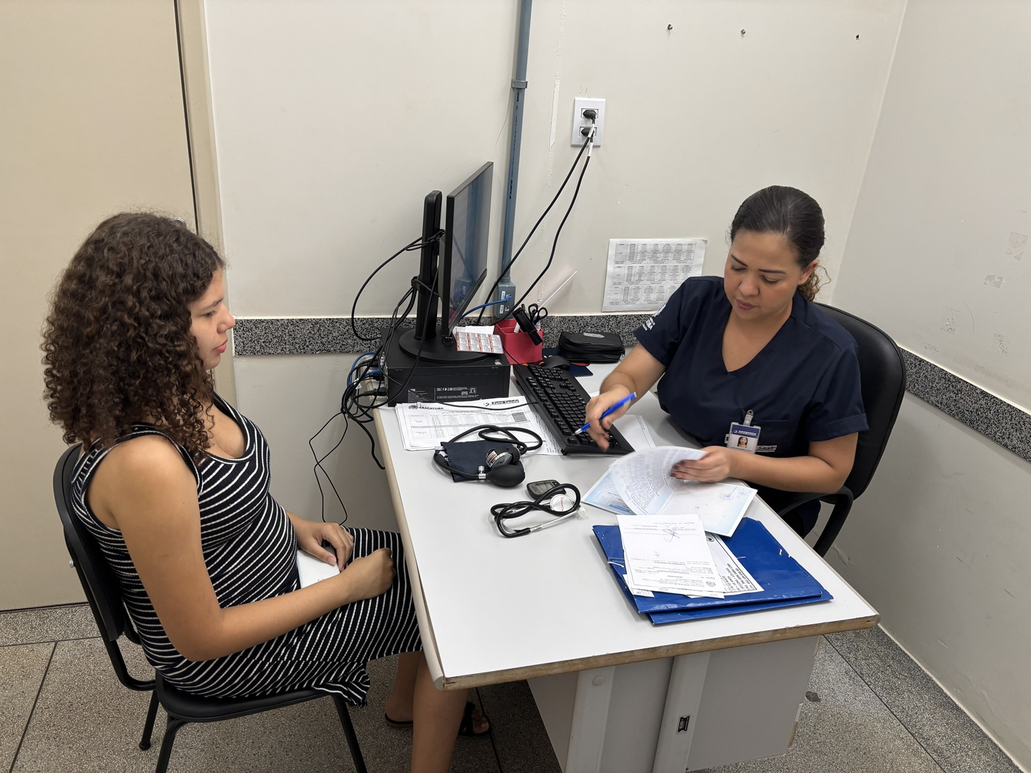 Assim que a gestante chega para o primeiro atendimento, muitas vezes assustada, insegura ou cheia de dúvidas, é a enfermagem que faz o acolhimento inicial. São realizadas a abertura do pré-natal, a coleta de informações sobre rotina, trabalho, histórico familiar, condições de saúde e exames iniciais, incluindo testes rápidos para infecções sexualmente transmissíveis.