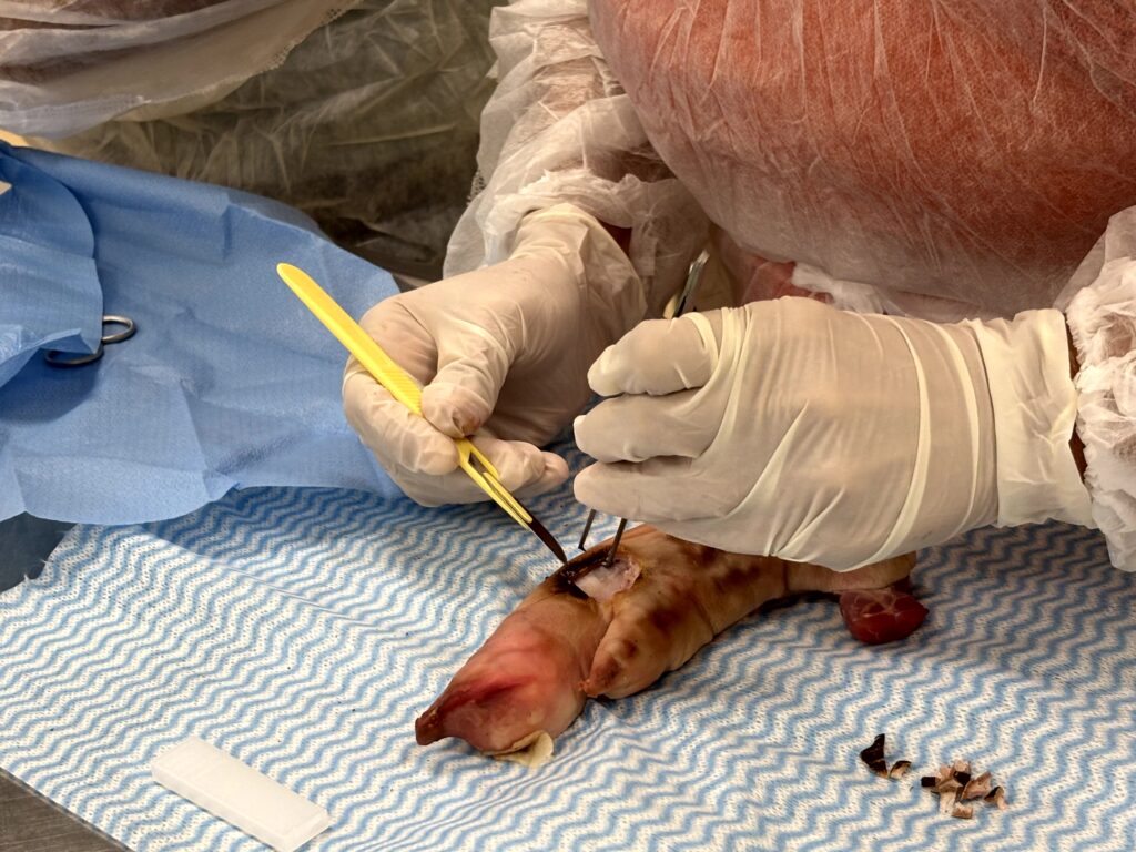 Além da aula técnica, os profissionais puderam colocar em prática duas técnicas apresentadas, usando um pé de porco como exemplo.